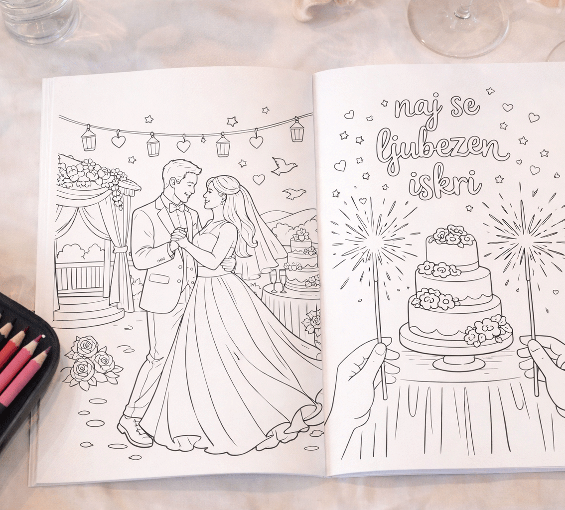 Poročna pobarvanka je čudovit dodatek za poročni dan, namenjen tako otrokom kot odraslim, ki si želijo trenutek sprostitve in ustvarjalnosti.